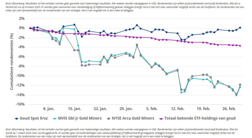 Bron: Bloomberg. Resultaten uit het verleden vormen geen garantie voor toekomstige resultaten. Alle reeksen worden weergegeven in USD. Rendementen zijn alleen prijsrendementen (exclusief dividenden). Elke lijn wordt op 1 maart 2024 naar nul teruggebracht. Er worden geen veronderstellingen voor valuta-afdekking of hefboomwerking toegepast. beleggen brengt risico’s met zich mee, waaronder mogelijk verlies van de hoofdsom. De rendementen van een index zijn niet representatief voor de rendementen van een strategie. Het is niet mogelijk om in een index te beleggen.