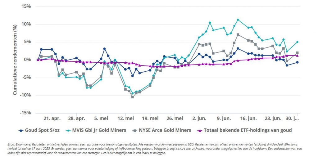 Bron: Bloomberg. Resultaten uit het verleden vormen geen garantie voor toekomstige resultaten. Alle reeksen worden weergegeven in USD. Rendementen zijn alleen prijsrendementen (exclusief dividenden). Elke lijn is herleid tot nul op 17 april 2025. Er worden geen aannames voor valutahedging of hefboomwerking gedaan. beleggen brengt risico’s met zich mee, waaronder mogelijk verlies van de hoofdsom. De rendementen van een index zijn niet representatief voor de rendementen van een strategie. Het is niet mogelijk om in een index te beleggen.