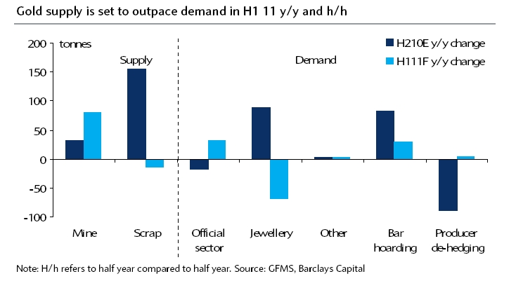 In totaal kan het aanbod de vraag overtreffen.Volgens Barlays was een van de belangrijkste factoren achter de stijging van de goudprijs in de afgelopen tien jaar overschakeling van de markt van verkopers naar kopers. Daarnaast was het terugdraaien van de hedges van producenten een positieve factor.Volgens GFMS zal de vraag naar juwelen met 7% afnemen. De afgenomen vraag zal dus opgevangen moeten worden door een grotere investeringsvraag. Het Londense adviesbureau verwacht een goudprijs van gemiddeld $1.402 in de eerste helft van dit jaar.