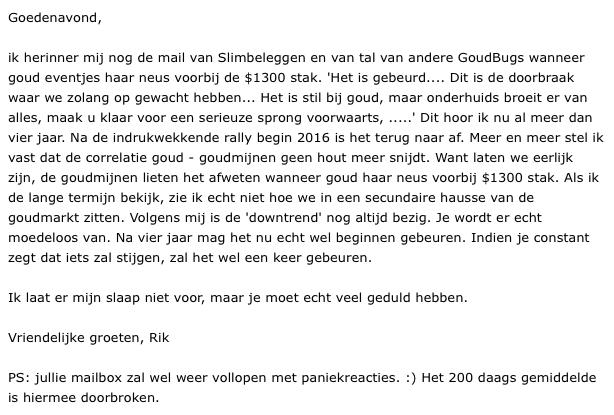 Wij kregen vandaag een interessante e-mail in onze inbox. Het was van onze collega site slimbeleggen.com. Zij kregen een reactie van een van hun lezers die teleurgesteld reageerde op de recente ontwikkeling van de goudprijs. Die zakt in de afgelopen dagen door een technisch steunniveau waardoor de koers flink onder druk kwam. “De constante teleurstelling begint zwaar te wegen op de stemming, van de ‘goudgemeenschap’. Beleggers in goud, die al jaren wachten op de uitbraak, zijn het wachten stilaan zat”, aldus slimbeleggen.