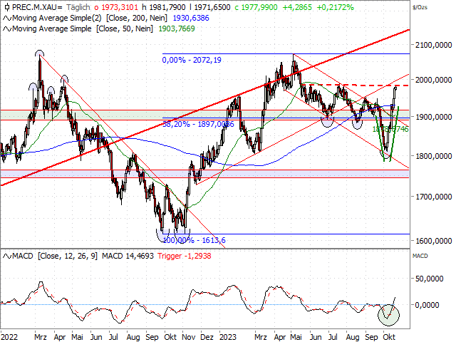 Er waren onlangs een hele reeks constructieve grafieksignalen. De goudprijs overschreed gisteren de volgende sleutelmarkeringen, aangezien de hoogtepunten van september op 1.947/1.953 USD de volgende belangrijke katalysator markeren. Door de definitieve sprong over deze hindernissen vormt de recente koersontwikkeling een “V-vormig” omkeerpatroon (zie grafiek). Puur rekenkundig levert deze formatie een berekend vervolgpotentieel van 140 USD op – meer dan voldoende om perspectief te bieden op de historische hoogtepunten van 2020, 2022 en 2023 bij 2.070/2.072.