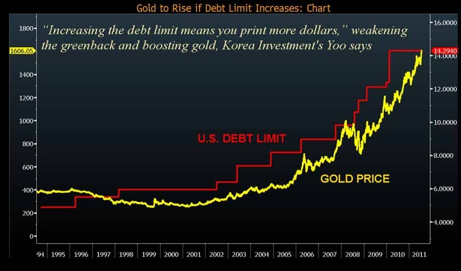 Het is als twee auto’s die met een bloedgang recht op elkaar af rijden. Wie het eerst zijn stuur omgooit, heeft verloren. Dus die verhoging komt er, zij het misschien last minute of mogelijk enkele dagen te laat. Een plafondverhoging betekent niets anders dan meer dollars bijdrukken en alleen om die reden al kan goud verder doorstijgen.
