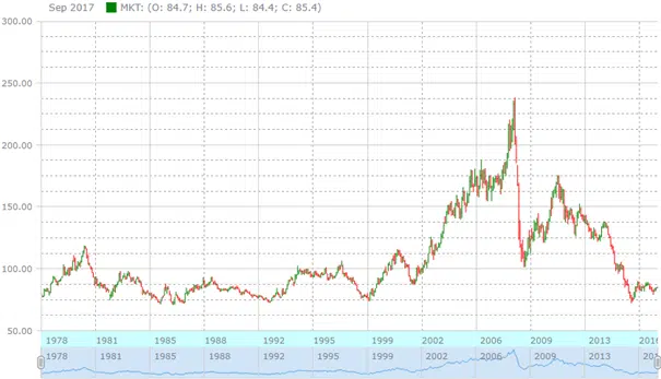 Indien naar het koersverloop van de brede grondstoffenindex gekeken wordt, valt behalve enorme stijgingen en dalingen in de periode 2001-2016 op dat er na bijna 40jaar nauwelijks rendement is gerealiseerd. Het is dus zeker geen goede lange termijn belegging. Wel een beleggingscategorie om in te “traden”. Volatiel zijn grondstoffen absoluut. Daarnaast laat de grafiek zien, dat deze index 5 keer in de geschiedenis een dieptepunt kende in de zone 73-80. De laatste keer was afgelopen jaar, namelijk een koers van 76 (op slotbasis). De eerste vier maal herstelde de grondstoffenmarkt naar niveaus tussen de 90en 110. Ook nu in 2017 vertoont de grondstoffen index signalen van bodemvorming. De huidige koers staat op 85 punten.