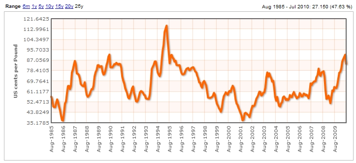 Toch eens even kijken wat de katoenprijzen hebben gedaan, zeg, de laatste 25 jaar: