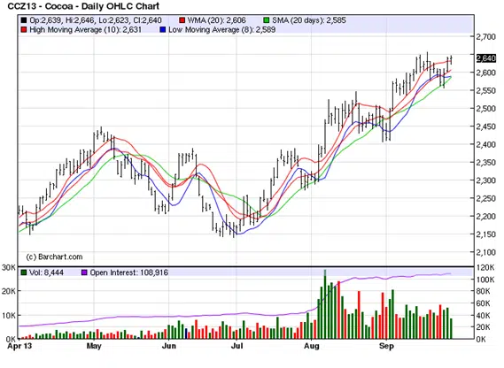 Cacao wordt duur betaald vandaag de dag. Prijzen in Londen flirten alweer een tijdje met de grens van £ 1.700 per ton. In New York bereikte de prijs voor een ton cacao een niveau van $ 2.620. Dat vertegenwoordigde een stijging van 7,6% in een maand tijd en van 21% in het derde kwartaal. Volgens analisten van Macqurie, een bank gespecialiseerd in soft commodities komt aan de stijging voorlopig nog geen einde. Zij verwachten voor het vierde kwartaal een prijsniveau tussen $ 2.500 en $ 2.900. Dat niveau is in geen twee jaar meer gezien.