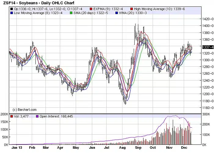 Het is momenteel erg onduidelijk wat het oogstjaar 2013 – 2014 zal brengen. Rabobank, een belangrijke agrispeler, verwacht dat oogsten van bijvoorbeeld soja en mais zonder meer goed zullen zijn en dat zal een prijsdrukkend effect tot wel 20% vanaf het huidige niveau geven. Commerzbank deelt de visie van Rabobank, dat bij de huidige oogstverwachtingen in 2014 het gevoel van schaarste totaal zal vervliegen. De bank noemt een prijs van $ 11,50 per bushel in 2014 zeer reëel. Nu ligt de prijs nog boven $ 13.
