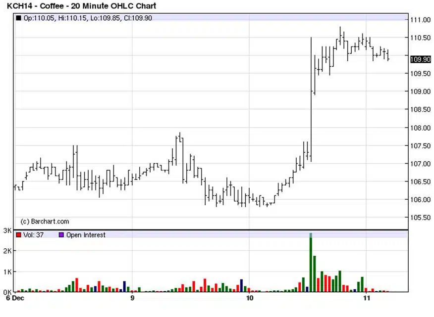 Onlangs heeft INVINCO u gewezen op de mogelijke stijging van de koffieprijs. Dat gebeurde bij een prijs van $105,60 cent per pond. Afgelopen week noteerde koffie $ 110,50 cent per pond.  U moet daarbij bedenken, dat op de markt voor futures één (1) cent een waarde van $ 375 vertegenwoordigt. Met een margin van $ 8000 had u een bruto rendement van 22,9% kunnen genieten.