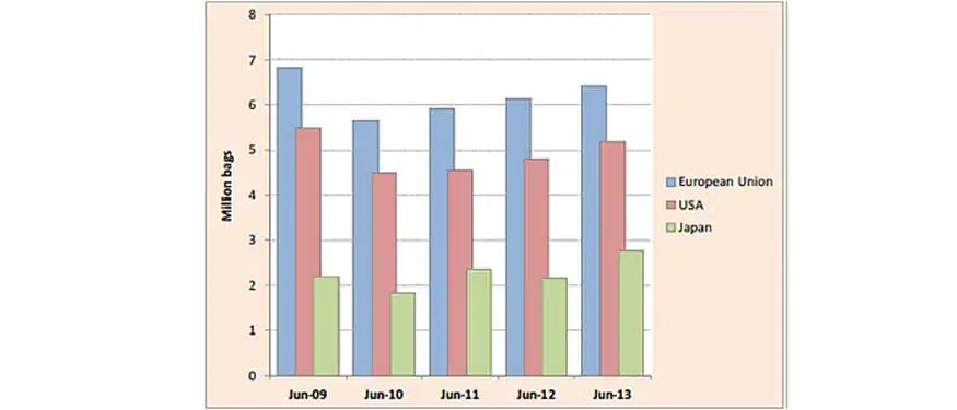 De laatste factor, die bepalend is voor de koffieprijs, is die van de consumptie. Na enkele jaren van stagnatie zit die weer in de lift in de belangrijkste exportlanden. In Europa, de VS en Japan wordt weer meer koffie gedronken (Figuur 3). Maar niet alleen in de traditionele importlanden wordt weer meer gedronken, maar ook in de exporterende landen zelf en in de zogeheten opkomende landen. Volgens the International Coffee Organization zal in 2013 de consumptie wereldwijd met 2% à 2,5% stijgen. In Indonesië is in 10 jaar tijd de koffieconsumptie verdubbeld naar 2,5 miljoen balen. Die snelle stijging van de consumptie in de opkomende en producerende landen is te danken aan de sterk groeiende middenklassen aldaar.