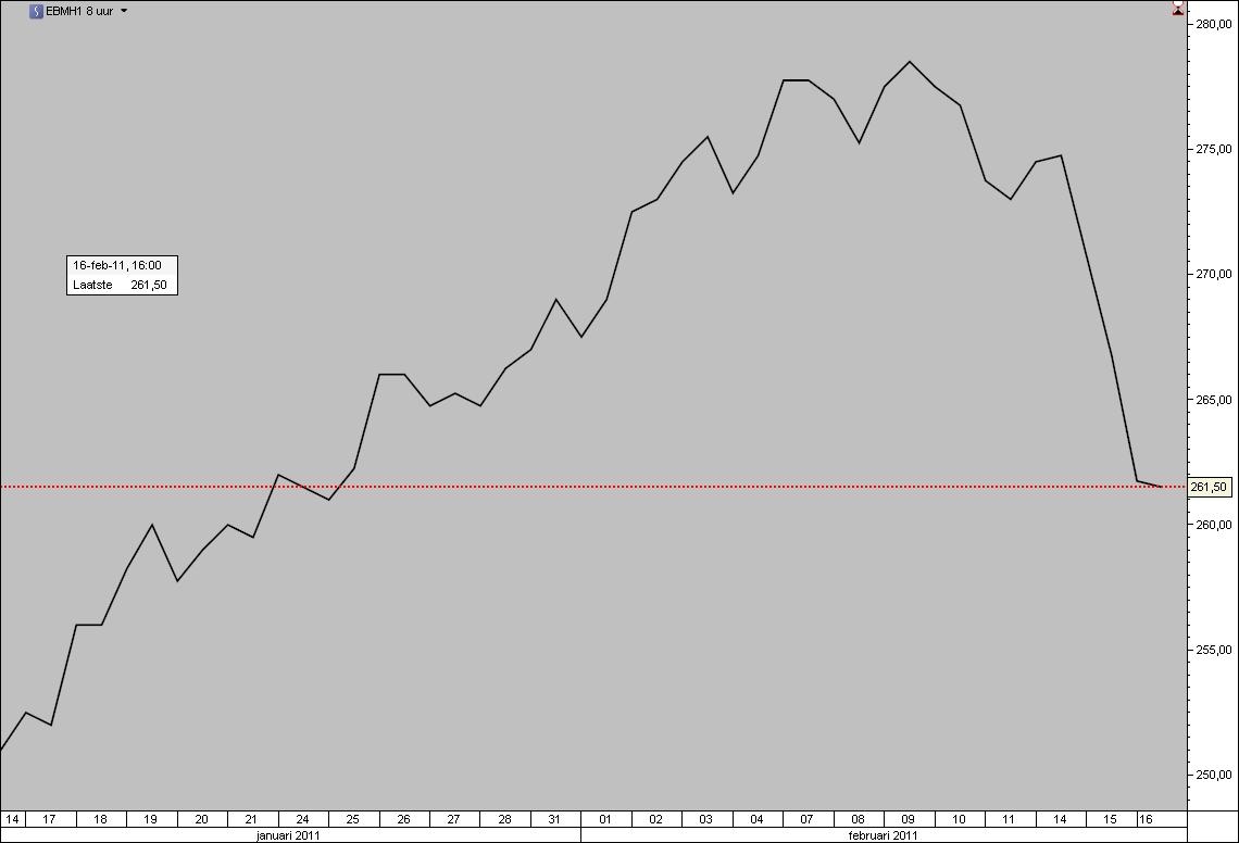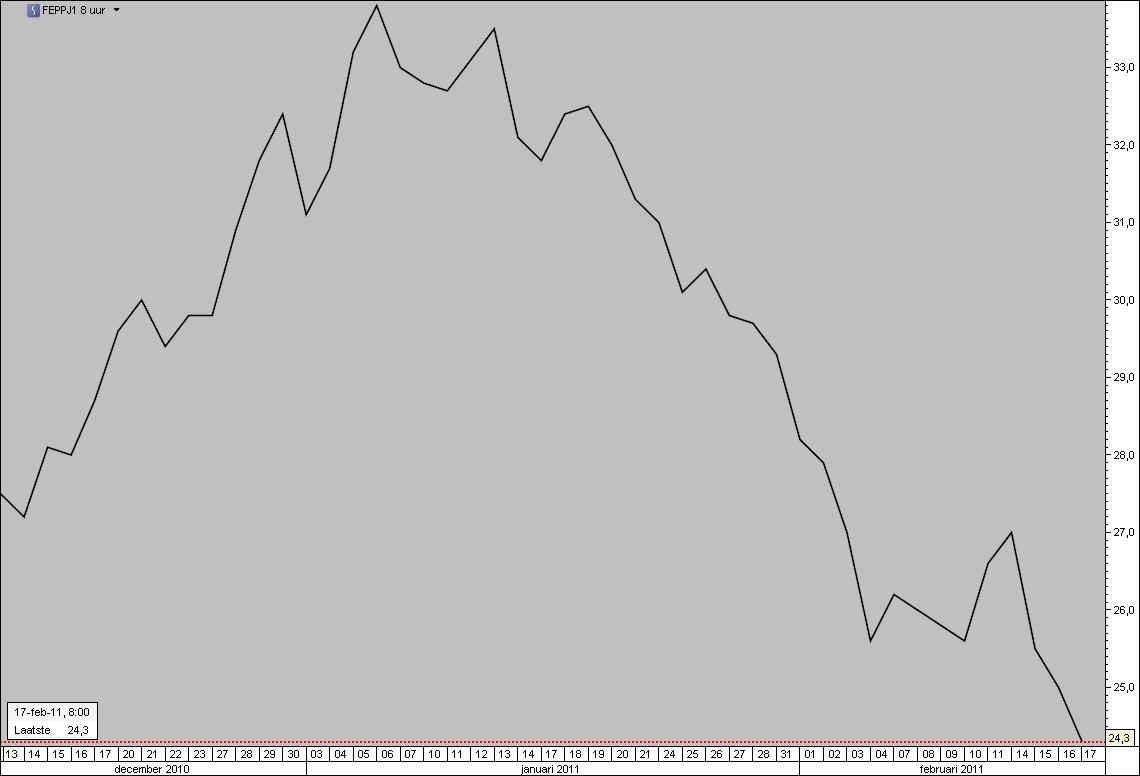De koers van aardappelen is dit jaar een stuk hoger als voorgaande jaren. Het hoogste punt voor de levering April 2011 (oogst 2010) noteerde €34.20 per 100 kg. Op dit moment (17-2 om 10:55) handelen we op €24.40. Dit mag gerust een forse daling genoemd worden ten opzichte van het hoogste niveau in januari. Om U een idee te geven van de volatiliteit; vorig jaar sloot de april koers op €9.60.