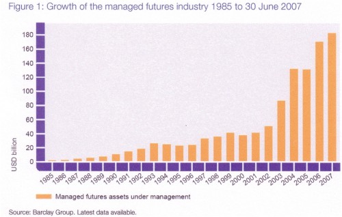 Er zijn nu ongeveer 800 CTA’s geregistreerd bij de National Futures Association (NFA), dit is een zelfstandige organisatie in Amerika voor futures-en optiemarkten. In de grafiek hieronder is de hype in CTA’s te zien.