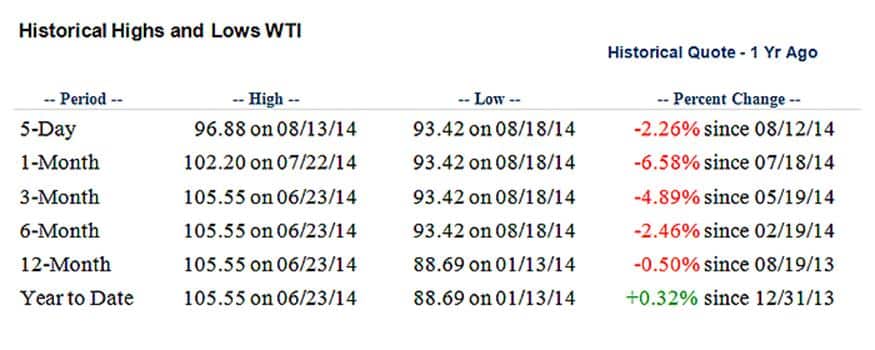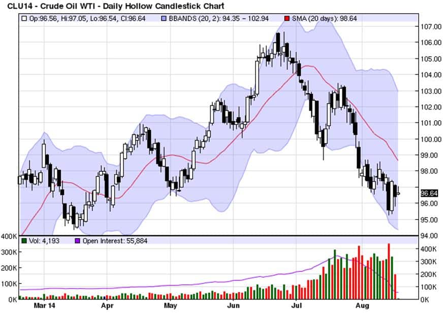 Tegenover een toenemende productie in de Verenigde Staten, maar ook in Canada, staat een stagnerende of licht teruglopende vraag naar olie. Voor dit jaar zal de vraag gemiddeld 91,56 miljoen vaten per dag bedragen en voor 2015 zit er een lichte stijging naar 92,96 miljoen vaten per dag. De stagnerende vraag naar olie is niet in de laatste plaats te danken aan een zwakke economische ontwikkeling in Europa. De stagnerende vraag heeft een kalmerende uitwerking op de markten. Dat is temeer begrijpelijk, omdat ook de productie van OPEC blijft stijgen. In juli lag die op 30,44 miljoen vaten per dag. Die productie gaat komende maanden nog verder stijgen, omdat in Libië de productie weer opgang is gekomen. De eerste tankers gevuld met olie hebben alweer de haven van Ras Lanuf verlaten.