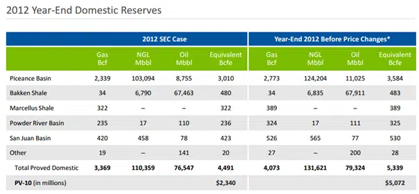 WPX Energy heeft in totaal 4,073 biljoen kubieke feet (TCF) proved aardgas in bezit. Met de komst van de nieuwe bron Niobrara kan de totale bezitting worden uitgebreid naar 18 TCF aan proved, probable en potential reserve. Op basis van de historische gegevens kan men uitgaan van $1,25 per kubieke feet, dus een totale waarde van $5,072 miljard.
