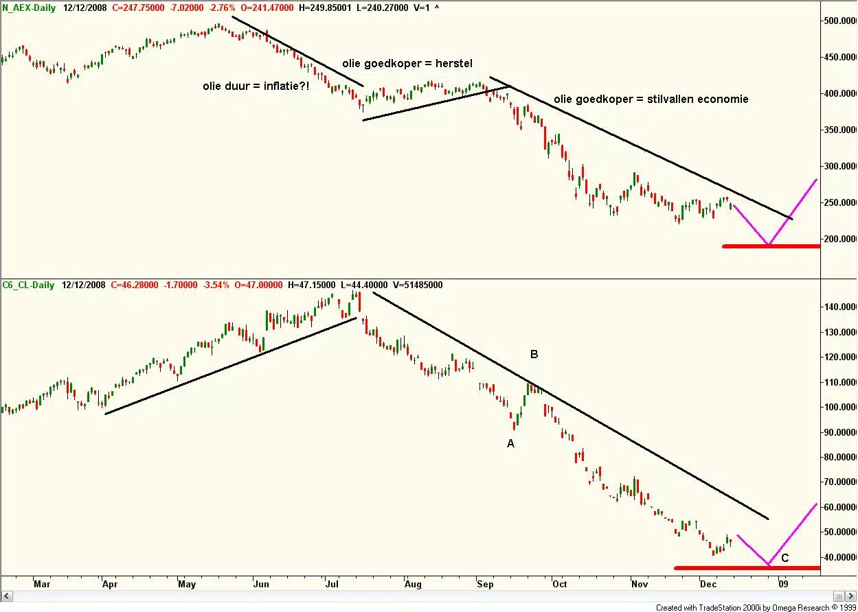 De olieprijs lijkt af te stevenen op minimaal een korte – tot middellange termijn bodem. Mijn favoriete koersdoel is 36 / 37 dollar. Daarmee lijkt een complete dalingsbeweging vanaf het hoogtepunt van juli 2008 rond 145, afgerond. Ongelooflijk, want als dit, wat ik vermoed, deze maand gebeurt, is de olieprijs binnen 6 maanden met 75% gedaald.