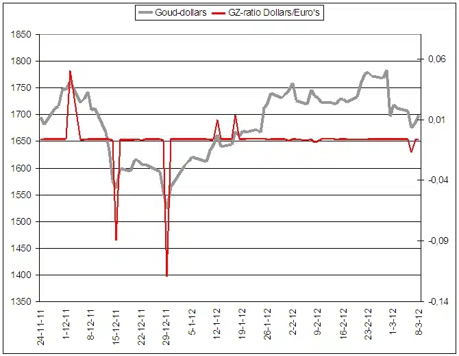 @Ivet De crux van het verhaal is het verschil dat optreedt tussen de G/Z-ratio in dollars tov de G/Z-ratio in euro’s. En dat je aan de hand van dat verschil kunt bepalen hoe belangrijk een top of een bodem is.