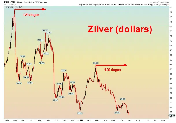 Vanaf de top op 25 april 2011 deed zilver er 120 dagen over om een lagere top neer te zetten op 23 augustus 2011. Projecteren we deze 120 dagen op de top van 29 februari 2012, dan geeft dat een draaipunt, in dit geval een bodem, op 28 juni 2012. Kijken we naar de grafiek van de afgelopen dagen, dan zien we inderdaad een bodem op 28 juni op $26,12. Op het moment van schrijven kost 1 ounce zilver inmiddels $27,30, dus van een flinke opvering, ruim 4%, is al sprake.