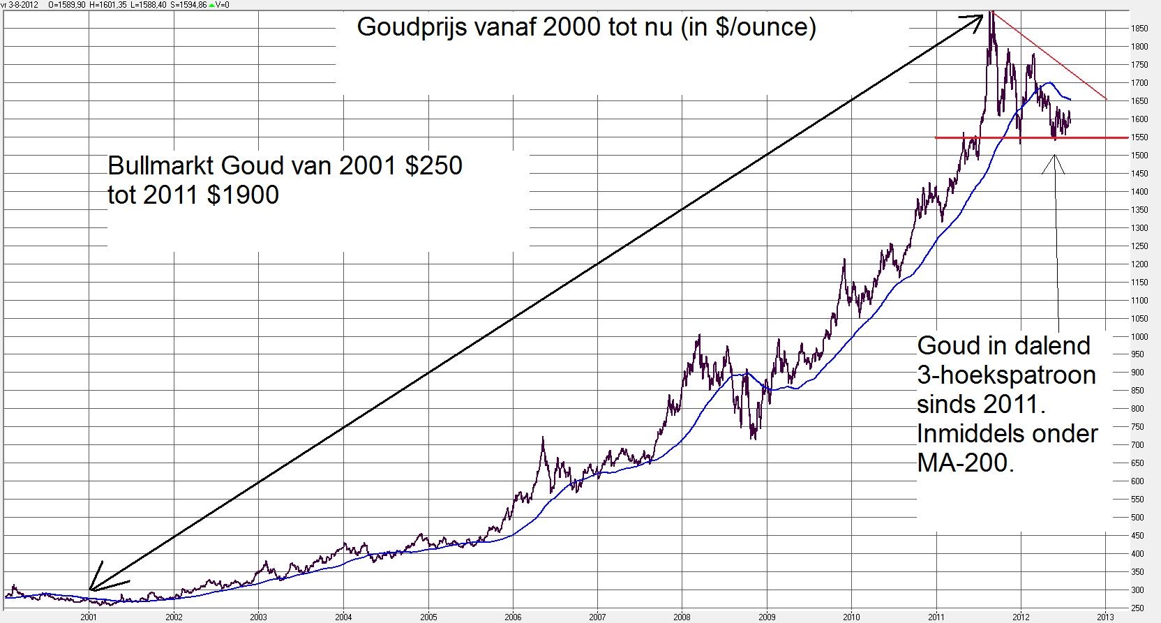 Bullmarket Goud duurde van 2001 ($250) tot 2011 ($1900)
