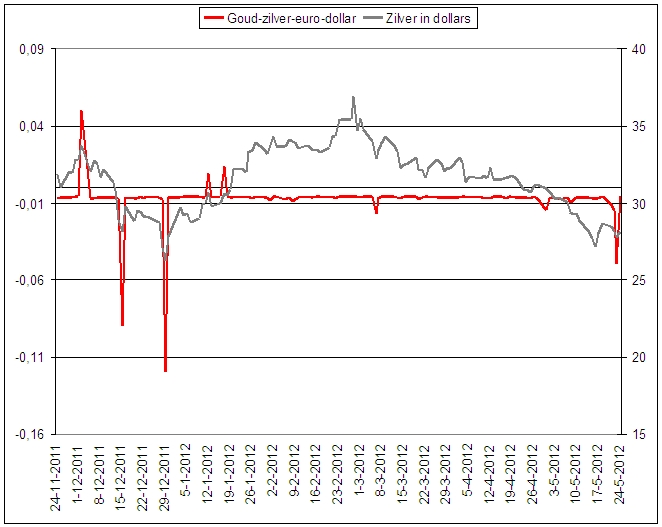 Tot zover niets bijzonders. Nu weten we dat de goud/zilver-ratio op zich geen tool is om voorspellingen voor de korte termijn te doen ten aanzien van de koersen van goud en zilver. Enige tijd terug echter heb ik nagegaan of er wellicht verschillen optreden tussen de goud/zilver-ratio in dollars en die in euroās. En dat bleek het geval. Overigens niet in alle gevallen, maar ALS zich een duidelijke āprikkerā opwaarts of neerwaarts voordeed, dan is de kans zeer groot dat we een belangrijke top of bodem te pakken hebben. Zie hier een overzicht sinds november 2011. Hoe groter de prikker, des te belangrijker het draaipunt.