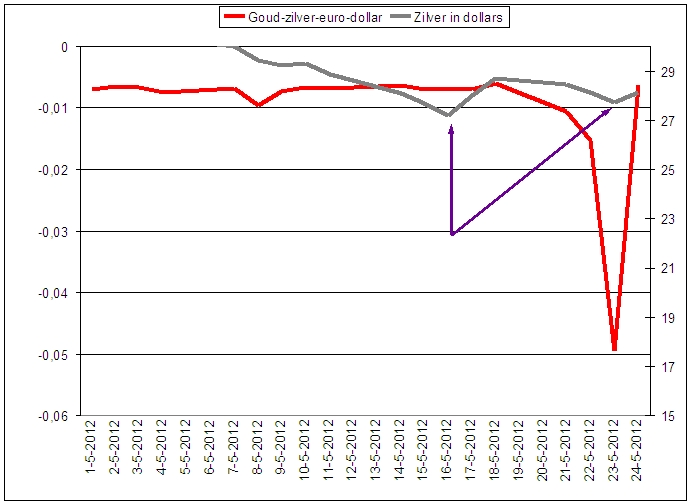 De belangrijke bodem van 29 december laat de diepste prikker in tijden zien. De bodem van 16 mei liet geen prikker zien. Ik vermoed dat zoān prikker iets zegt over de paniek die in de markt zit waardoor goud en zilver in dollars tijdelijk afwijkt van goud en zilver in euroās. In tegenstelling tot 16 mei liet 23 mei wĆ©l een prikker zien. Niet een hele diepe, maar toch wel diep genoeg om interessant te kunnen zijn. Hier zien we de grafiek wanneer we inzoomen. De paarse lijnen wijzen naar de bodem van resp. 16 mei en 23 mei.