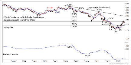 Al eind 2012 schreven wij in onze beurscommentaren dat er een draai in de ontwikkeling van de lange rente in (Noord)Europa aan zat te komen. Wij verkochten toen obligaties van de Nederlandse Staat met looptijden van 10 jaar en langer, omdat deze in een omgeving van stijgende rentes qua koersvorming kwetsbaar zijn. In figuur 1 tonen wij de ontwikkeling van de 10-jaars rente in Nederland over een periode van ruim 11 jaar. Zij die onze maandelijkse uitgave “De Technische Belegger” regelmatig lezen kennen deze grafiek.