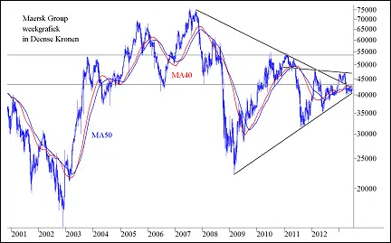 Een andere benadering om te zien waar de cyclus van de containervaart zich momenteel bevindt is het bekijken van de beurskoers van aandelen van Rickmers. Maar er zijn geen aandelen van het bedrijf op de beurs genoteerd en er is weinig andere oudere financiële informatie van het bedrijf beschikbaar (ouder dan 2010). Daarom hebben wij de koersontwikkeling van de aandelen van de grootste klant van Rickmers erbij gehaald, het Deense Maersk.