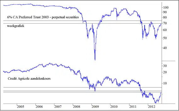 En dan is er nog het bedrijfsrisico van CA zelf. Zoals gezegd is CA een van de zwakkere Franse banken. Als er nieuw kapitaal nodig is, dan is de kans groot dat de houders van achtergestelde effecten zoals de Perps door Europa zullen worden gedwongen om een deel van de pijn te dragen. Om te beginnen ontvangt u dan geen rente gedurende wellicht meerdere jaren en het effectieve rendement dat wij hierboven hebben uitgerekend is alleen geldig als er daadwerkelijk rente wordt uitgekeerd!