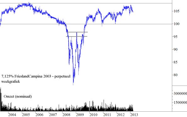 Ten tijde van de kredietcrisis zakte ook deze obligatie flink onderuit. Maar met een laagste koers van 76% bleef de schade relatief gezien (ten opzichte van de meeste bancaire perpetuals bijvoorbeeld) beperkt. Maar de recente hoogste koers van 107,5% lijkt wel erg hoog gegrepen, vooral wanneer u bedenkt dat FrieslandCampina elk jaar opnieuw kan besluiten om de obligatie tegen 100% af te lossen. In 2012 steeg de koers direct na de coupondatum in juni van 104% naar 107% om daar vervolgens de rest van het jaar te blijven liggen. De dip, begin 2013, hing samen met de nationalisatie van SNS Reaal.