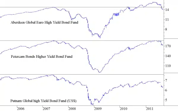 De keuze voor de in de grafiek getoonde fondsen is willekeurig. Boven elkaar ziet u de high Yield-fondsen van respectievelijk Aberdeen (ISIN-code LU0119176310), Petercam (ISIN-code LU0174545367) en Putnam (ISIN-code IE0001478001, niet bij Binck verkrijgbaar). Zij is ingegeven door het feit dat alle drie de fondsen geen dividend uitkeren (daardoor is de prestatie zuiverder te vergelijken), doordat er een ruime koershistorie voorhanden is, doordat wij (twee van) deze fondsen ook via onze eigen bank kunnen krijgen (BinckBank) en (in het geval van het fonds van Putnam) om ook een in $’s genoteerd fonds ter vergelijking te laten zien. De koersontwikkeling van de overige door ons bekeken fondsen wijkt niet af, waarbij er uiteraard wel verschillen in de jaarlijkse prestaties te zien zijn, maar dat is hier niet het doel van ons onderzoek.