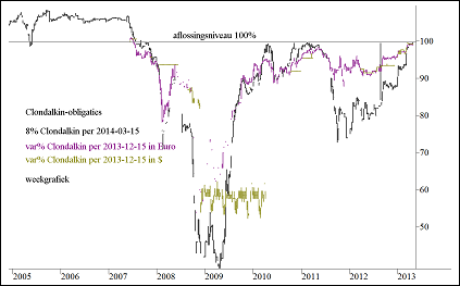Om de obligatie, die in 2014 moet worden afgelost, ging het onze cliënt. Hij loopt nog maar kort en betaalt toch 8% terwijl de koers net onder 100% noteert, dus dat lijkt een deposito van 8% voor 10 maanden. De ISIN-code van de lening is XS0188274848 en de lening is niet-achtergesteld. De rente op de obligatie is in maart 2013 keurig betaald.