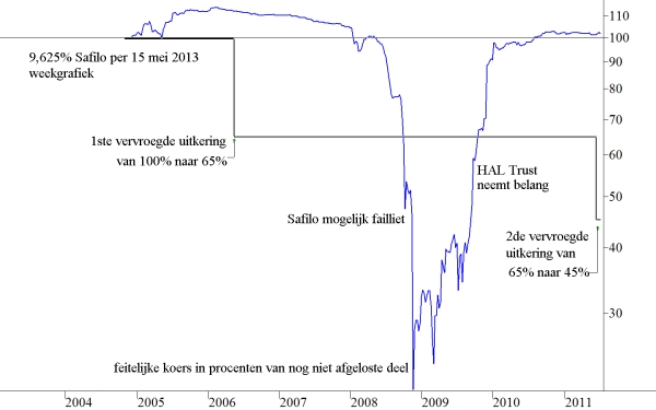 De koers van de lening is in 2008 flink gedaald (tot zelfs even 21,5%) toen Safilo onder haar schuldenlast dreigde te bezwijken. Vervolgens deed HAL Trust in 2009 een gedeeltelijke overname van het bedrijf waarna de koers van de lening weer helemaal herstelde (zie voor meer details ons artikel van “High Yield bonds van Safilo”).