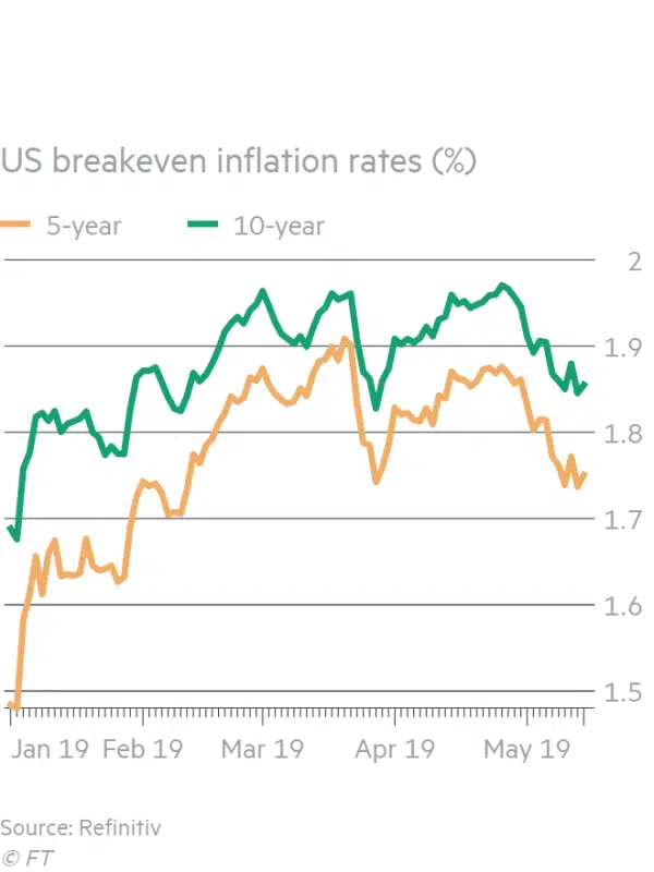 Toen president Trump aankondigde de tarieven op Chinese goederen en diensten te gaan verhogen, sloeg bij aandelenmarkten de schrik om het hart en koersen tuimelden. Op obligatiemarkten stegen de prijzen van obligaties van zogeheten veilige landen, terwijl het rendement op deze obligaties daalde. Toen de koersen van aandelen weer aantrokken, bewoog de obligatiemarkt amper of niet. Beleggers verkiezen blijkbaar op dit moment de veiligheid van de betrouwbare haven. Daar hebben ze voldoende reden voor. De tarievenoorlog kan de economie schaden, terwijl ook de inflatie blijft dalen.