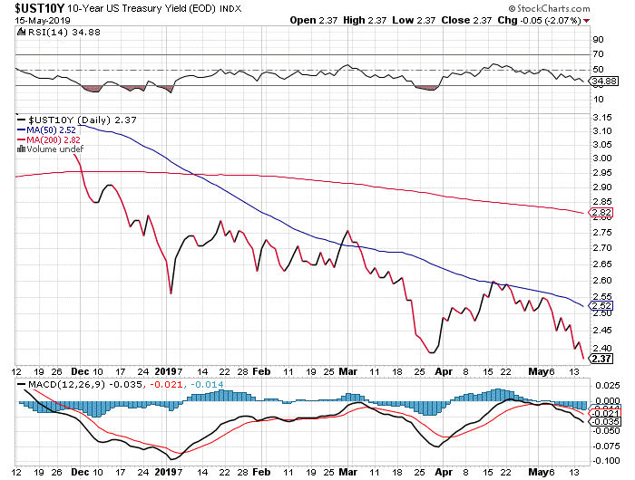 Afgelopen week dook het rendement op de 10jaars treasury onder 2,4%. Dat is op zijn minst opmerkelijk te noemen. Aan het begin van het jaar, toen markten zeer volatiel waren, daalde het rendement naar 2,55%. Het is duidelijk, dat de woordenstrijd tussen China en de VS zwaar op het rendement drukt. Naar mate de handelsonderhandelingen langer voortslepen, zal het gelijk van de obligatiemarkt steeds duidelijker worden. De wereldeconomie staat er minder glorieus voor dan aandelenmarkten ons willen doen geloven.