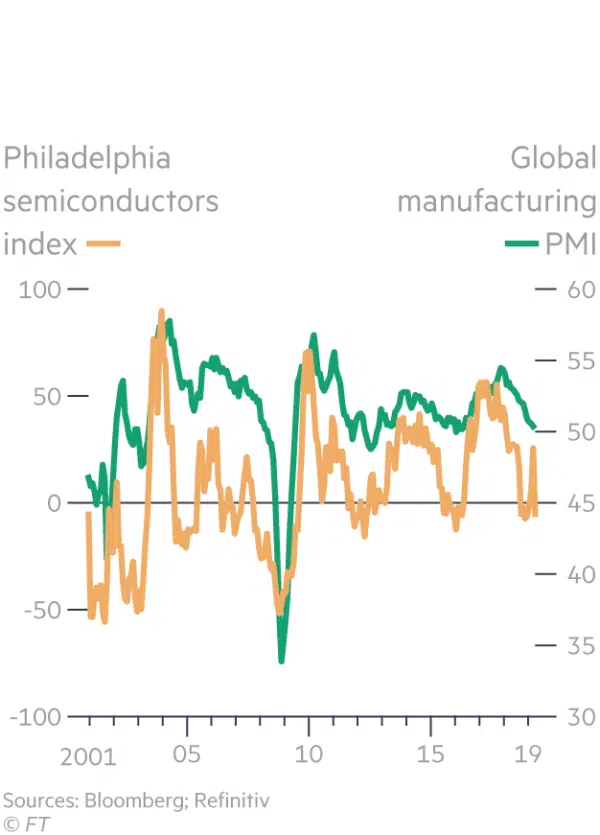 Bij de Deutsche Bank zijn ze er daarom van overtuigd dat een recessie al om de hoek gluurt. De koersontwikkeling van aandelen in de semiconductorsector loopt vooruit op de ontwikkeling van de wereldwijde manufacturing purchasing manager’s Index, zo denken ze daar. Ze voelen zich daarbij gesterkt door een recente studie van het IMF, die wijst op het belang voor de wereldeconomie van de smartphonecyclus. Het is juist de smartphone die een belangrijke twistappel is in de strijd tussen de VS en China. The global economic surprise index van Citi doet ook nog een negatieve duit in het zakje. Die is al in de min sinds april van 2018 en staat nu op -18,1.
