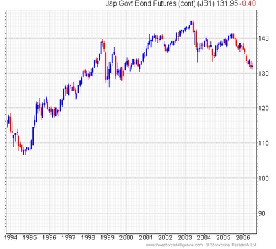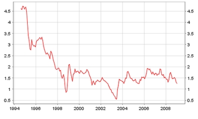 Net zoals bij ons vandaag stonden ze op 4% in 1994. Sindsdien zijn ze gezakt en blijven zakken. 15 jaar later staan ze nog steeds op 1,5%. Desondanks al die nieuwe staatsobligaties en al dat geprint had dit toch een positieve invloed op de waarde van die staatsobligatie die langzaam maar zeker omhoog ging van 115 naar 135: