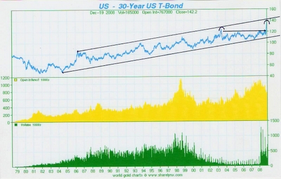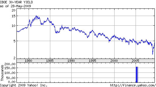 In 2009 hebben ze tot op heden groot gelijk gekregen. De winst van de 30 jarige staatsobligaties is weer weggesmolten met een rendement van -25%, wat een grote klap is. Dit omdat de rente weer stijgt: van 2,5% vorig jaar naar 4% nu. De inflationisten wrijven zich dan ook in de handen en roepen: “Zie je wel! De staatsobligaties crashen en de rentevoeten stijgen, dit zal alleen maar erger worden.”