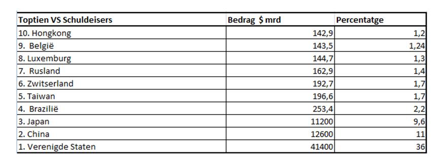 Vooral de twee landen met het grootste aandeel in VS schuld, China en Japan, hebben afgelopen weekeinde de VS dringend op hun verantwoordelijkheid gewezen. China bezit ongeveer 11% van de Amerikaanse staatsschuld. Dat is een bedrag van $ 1,26 biljoen. Japan is een goede tweede met 9,6% van de schuld ofwel $ 1, 12 biljoen. De minister van Financiën van China, Zhu Guangyao drong er publiekelijk bij de VS op aan om zorgvuldig om te gaan met de beleggingen van zijn land in Amerikaanse waarden. Hij wees er – niet ten overvloede – op dat China ‘waakt’ over de Amerikaanse investeringen. Uit Tokyo waren gelijksoortige geluiden te horen. Taro Aso, minister van Financiën, verklaarde ongerust te zijn over de mogelijke waardedaling van de Japanse beleggingen.