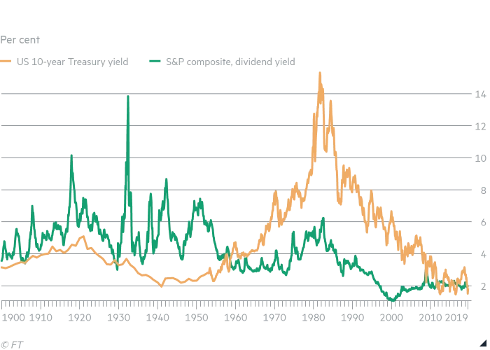 Aan die wetmatigheid kwam een einde in de jaren vijftig van de vorige eeuw, toen het rendement op de 10jaars treasury dat van het dividendrendement van de S&P 500 index begon te overstijgen. Ook toen duurde het lang voordat dit gegeven algemeen als nieuwe wetmatigheid werd geaccepteerd.