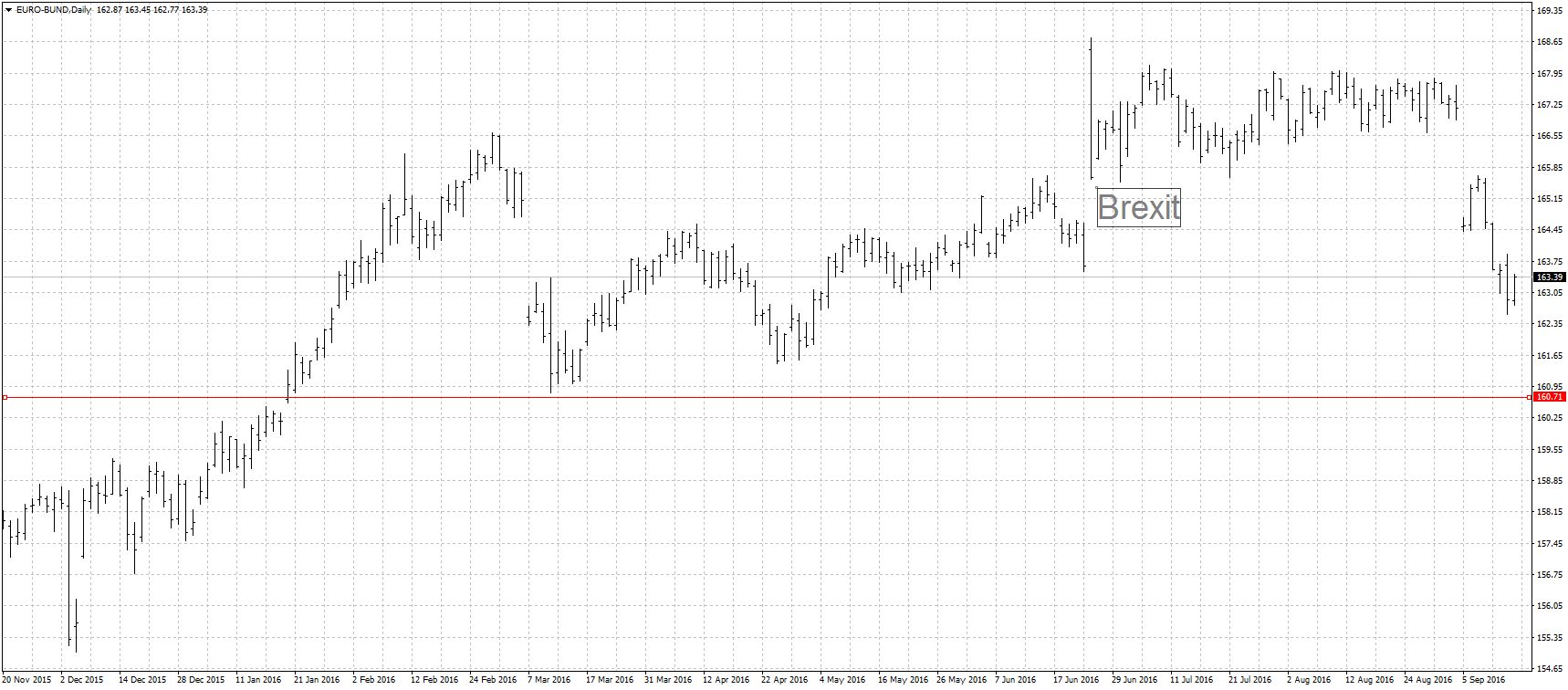 De rente op de Amerikaanse 10 jaar-staatsobligaties blijft dichtbij het laagste punt maar sprong vrijdag naar de hoogste stand sinds de Brexit referendum. In de onderstaande grafiek zien we de euro-bund dalen oftewel de rente loopt op.