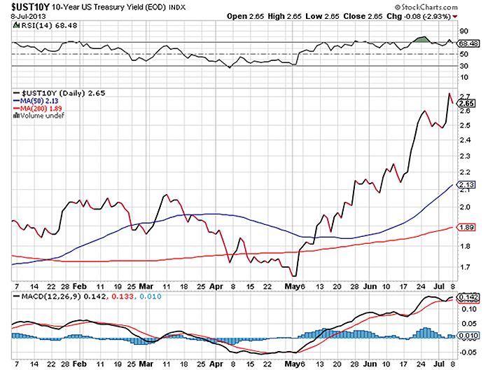 De oorzaak voor het massaal van de hand doen van de obligaties is de toespraak van Ben Bernanke op 22 mei voor het Amerikaanse Congres. Hij zei, dat wellicht de tijd was gekomen om serieus na te denken over het afbouwen van het monetaire stimuleringsprogramma QE3. Als reactie op deze toespraak steeg de rente op 10jaars schatkistpapier tot boven 2%. Amper een maand later, op 19 juni, was Bernanke specifieker over de afbouw en opnieuw maakte de 10jaars rente een sprongetje naar 2,35%. Op het moment van schrijven is de rente weer verder gestegen naar 2,65%. Beleggers zijn van mening, dat de Fed gaat afbouwen. Minder liquiditeiten in de markt betekent dat geld duurder wordt en derhalve dat de rente oploopt. Een hogere rente voor schatkistpapier betekent echter dat het rendement erop afneemt. Volgens berekeningen van de Fed bedraagt het reële rendement op de Amerikaanse treasuries deze dagen amper 1%. De afgelopen 20 jaar was het rendement 2,2%. Er zit dus nog slechts weinig toegevoegde waarde voor beleggers in de treasuries, zeker als je bedenkt, dat Amerikaanse aandelen nu een gemiddeld rendement van 6,4% laten zien.