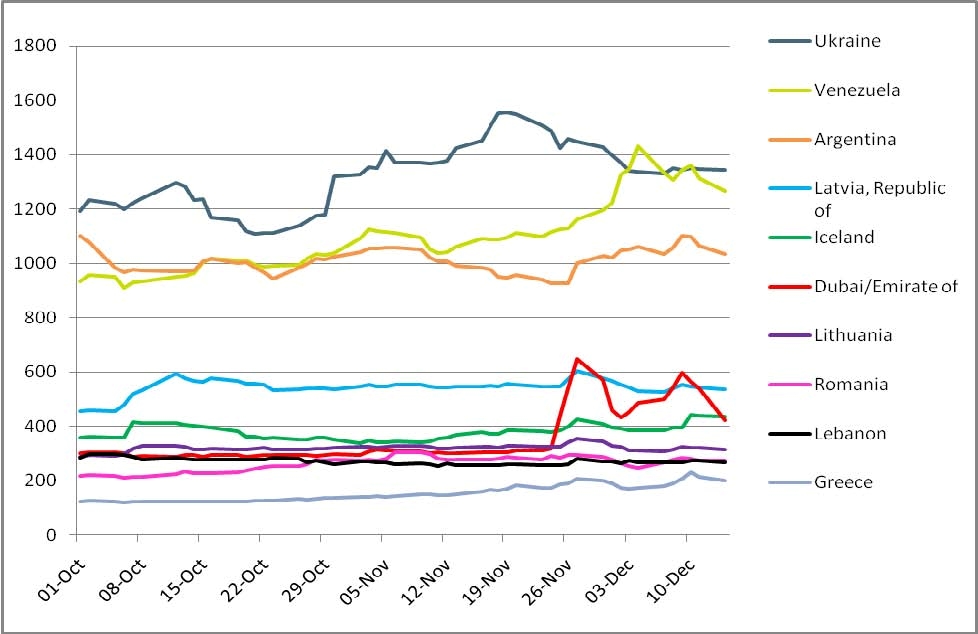 De top-10 wordt samengeteld op basis van de prijzen van credit default swaps. Bovenaan de lijst prijken de voormalige Oostbloklanden, conflicthaarden en dictaturen met veel olie.