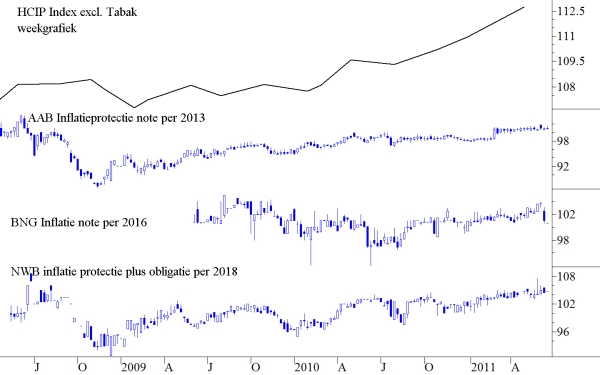 De inflatie volgens de HICP Index is toegenomen van onder de 2% een jaar geleden naar 2,9% eind april. Op basis van dit percentage zouden de coupons dus nu worden (mits zij vandaag vastgesteld zouden worden) respectievelijk 4,9%, 3,9% en 4,3%. De slotkoersen per 6 juni 2011 bedroegen respectievelijk 100,85%, 103,09% en 105,01%. Schrijven wij het deel van de koers boven de aflossingswaarde af gedurende de looptijd en veronderstellen we dat de inflatie voor elk van de drie leningen gedurende de resterende looptijd constant blijft, dan kan het effectief rendement bepaald worden op respectievelijk 3,68%, 2,69% en 2,97%.