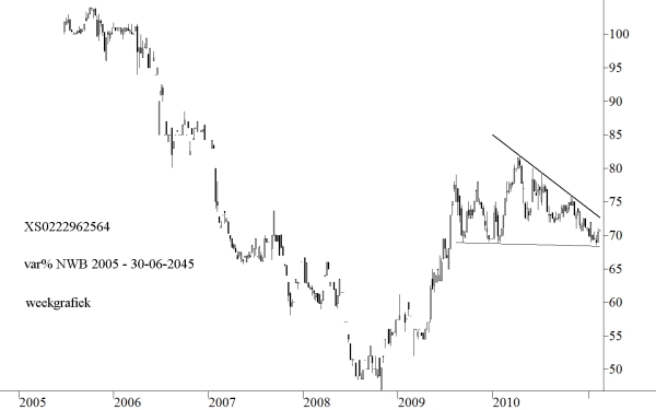 De voorwaarden van deze lening zijn als volgt. De lening is uitgegeven op 27 juni 2005 en wordt afgelost op 30 juni 2045 en draagt ISIN-code XS0222962564. De lening is niet achtergesteld. Aanvankelijk was de coupon 6%. Maar sinds 1 juni 2010 wordt de rente elk jaar herzien. Op 1 juni 2010 is de eerste nieuwe coupon vastgesteld op 2,927%. De koers enkele dagen geleden bedroeg 70,7%. In figuur 1 hebben wij een koersgrafiek opgenomen waarin u de ontwikkeling tot heden kunt zien van de koers van deze lening.