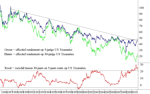 Beide lijnen hebben in de voorbije decennia een structureel dalende trend laten zien. De eerste belangrijke conclusie is dat de 30-jarige rente in de V.S. de dalende trend heeft gebroken. Het wachten is nog op een eerste hogere top om de doorbraak te bevestigen. Een correctie waarbij de rente weer wat zou zakken is op korte termijn goed denkbaar waarmee de bevestiging nog even wordt uitgesteld. De trend van de 5-jarige rente is nog niet gebroken.