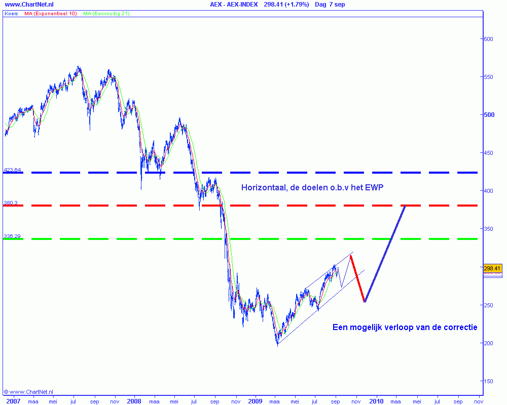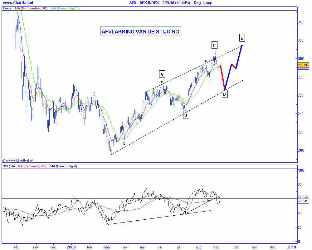 Door de daling onder 290 afgelopen week heeft de Amsterdamse AEX een eerste signaal afgegeven voor een meer geleidelijke verloop van de stijging. De kans op een daling richting 270-260 de komende weken is redelijk groot. Vervolgens verwacht ik nog een stijging tot globaal 315-320 om een complete beweging sinds de maart bodem af te ronden.