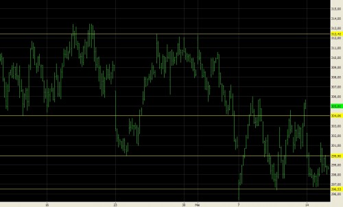 In de grafiek ziet u de steun op 296,50 en weerstand op 304 punten. Daarboven vinden een volgende hindernis op 312,4 punten.