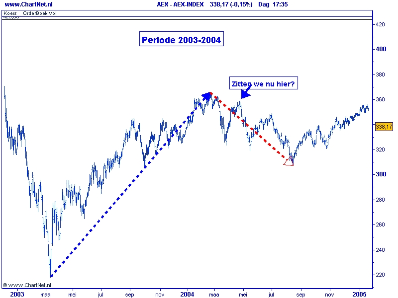 Met dank aan een goede vriend. Een voorbeeld van een groter herstel hebben we in 2003 gezien, na de eerste daling wist de AEX 82,55%Â van deze daling te herstellen. De totale correctie nam 6 maanden in beslag terwijl de stijging 11 maanden duurde en een omvang had van ongeveer 150 AEX punten. De stijging vanaf maart vorig jaar duurde 10 maanden en was tevens 150 punten. Kun je daar op dit moment conclusies uit trekken, nee maar het is aardig om te signaleren.