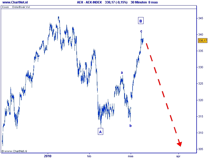 De kans dat er vandaag een top wordt geplaatst is groot daar de stijging sinds vorige week vrijdag vrijwel compleet is. Omdat dit tevens het einde van de golf C van B kan markeren en daarmee mogelijk het einde van de herstelfase, adviseer ik op dit moment om nog even de markt aan te zien en geen strategische posities in te nemen.