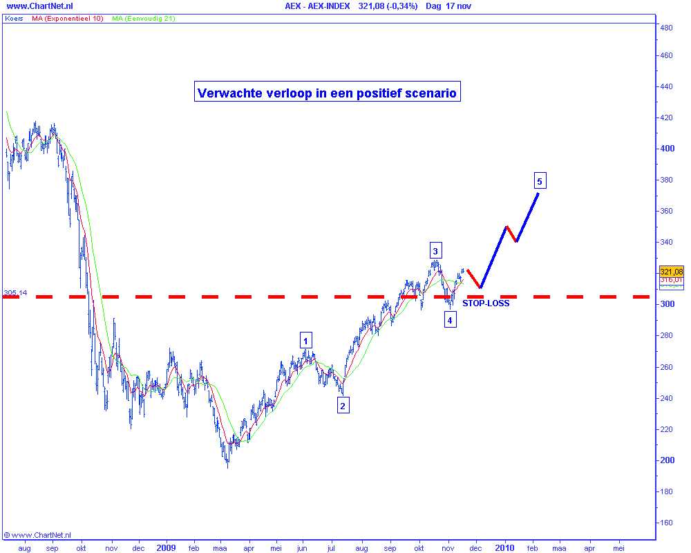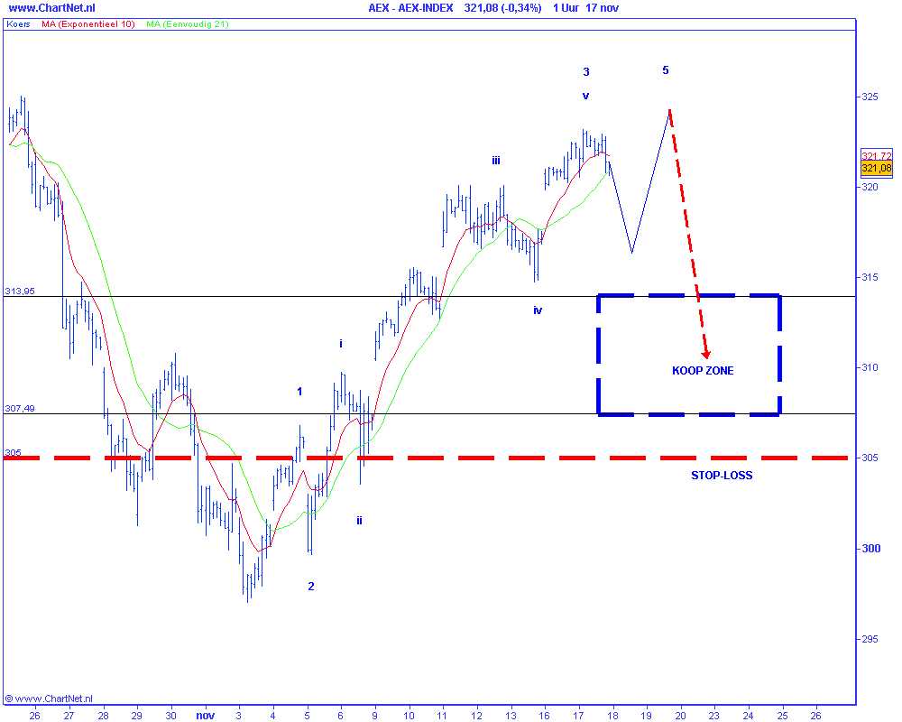 De kansen liggen naar boven. Een kleine correctie en vervolgens nog een nieuwe topje rond 324-326 is mogelijk maar voor dat ik posities inneem wacht ik een correctie af richting gebied 313-307. Een daling onder 305 is een harde stop-loss daaronder mag de AEX niet meer komen in het positieve scenario.