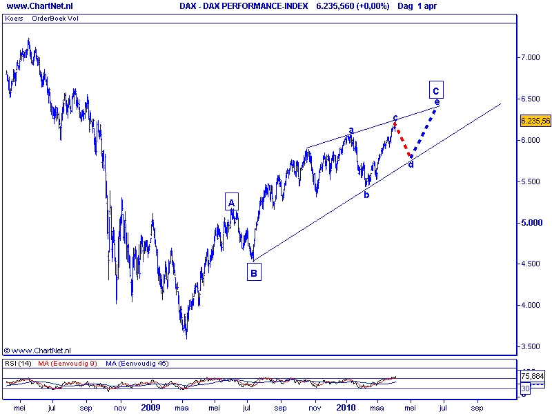 In de DAX zijn de contouren van deze stijgende wig duidelijker zichtbaar, tevens is daar door de recente stijging de RSI gestegen naar nieuwe toppen. Dit geeft aan dat er, op termijn,meer stijging verwacht mag worden.