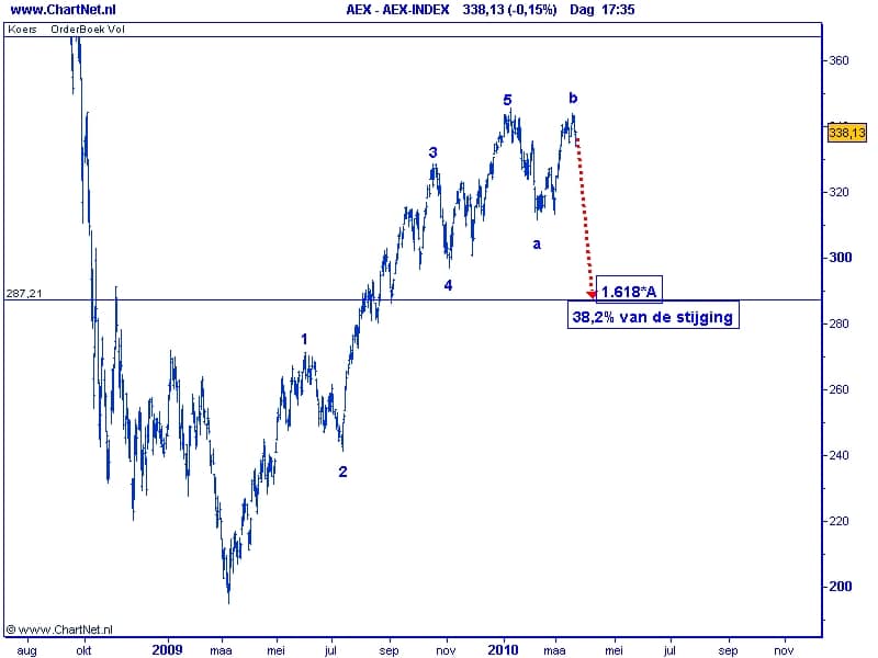 Het is een spannende tijd. Op basis van verhoudingen en patronen lijkt een min of meer forse daling de komende weken veel kans van slagen te hebben, hoewel het er trendmatig allemaal goed uitziet. Indien ook de markten in de VS de komende dagen een draai inzetten dan lijkt fase twee van de daling een feit. Een daling van de AEX tot 290 is, als aan deze voorwaarden is voldaan, mijn verwachting.