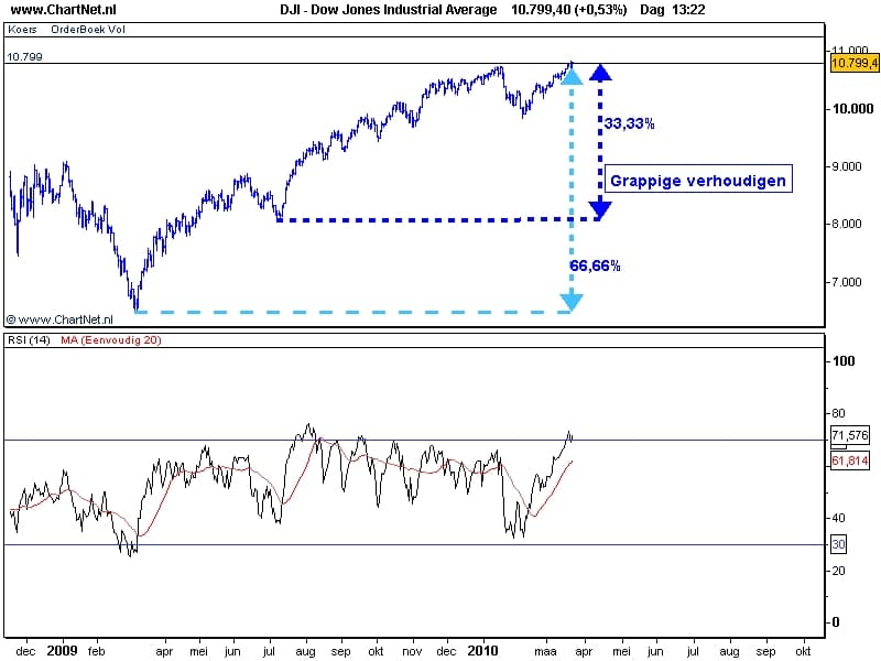 Zonder u te vermoeien met de theorie is er in de Dow Jones iets merkwaardigs aan de hand. Ik constateer dat de huidige top is uitgekomen op respectievelijk 66,66% en 33,33% stijging.